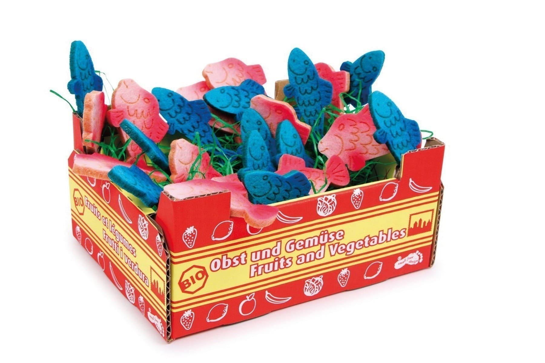Cageot avec 24 poissons en couleurs comme complément idéal pour les cuisines et magasins d‘enfant ! Poissons de bonne finition en feutre pour servir des menus succulents !