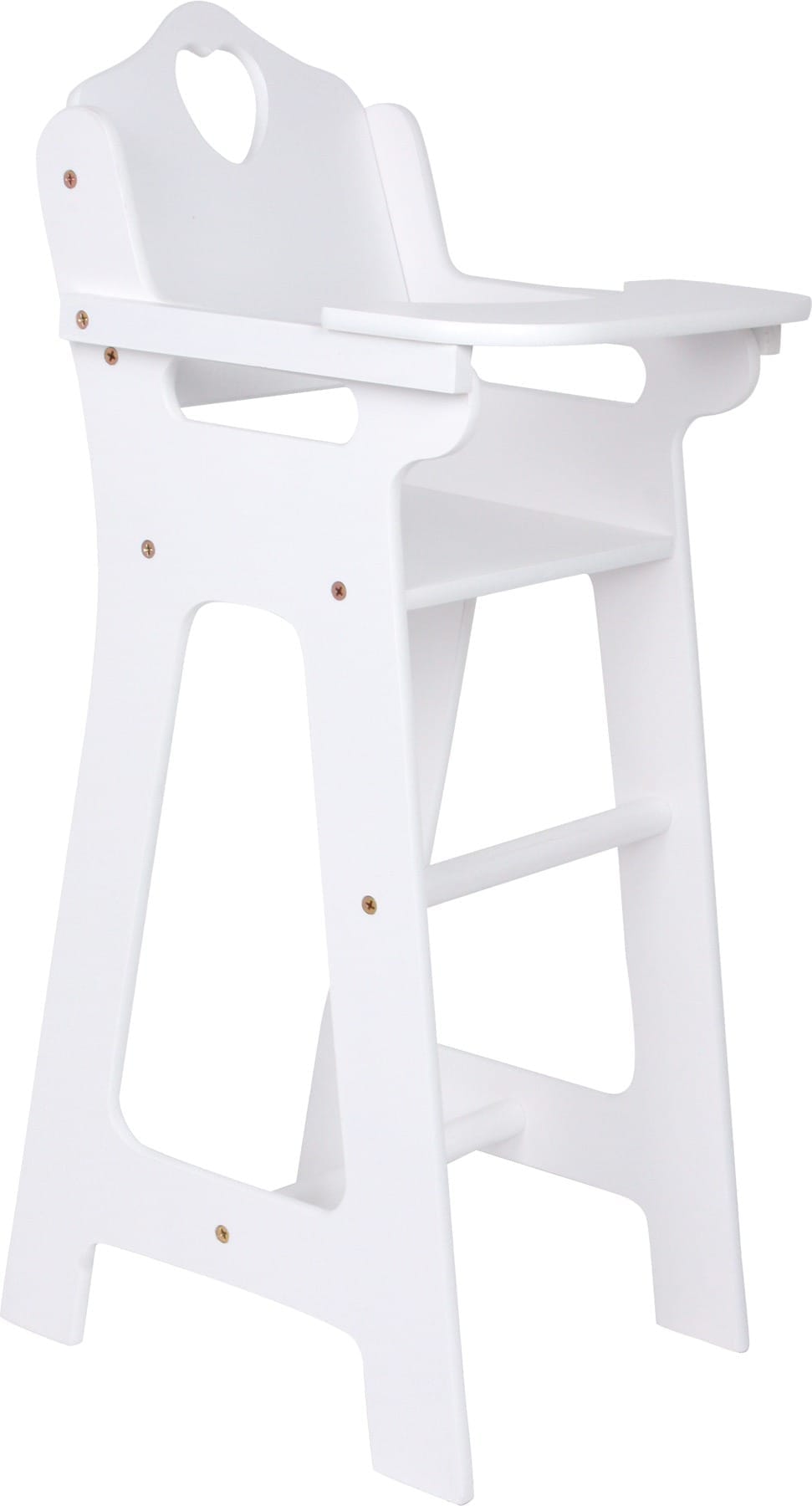 A table ! Cette chaise haute pour poupées en bois solide verni en blanc convainc immédiatement les parents de poupées ! Son point fort est la tablette rabattable, qui permet d’assoir et de sortir les poupées et les peluches facilement. La chaise haute avec l’adorable cœur sur le dossier de la chaise est un beau complément de jeu pour la chambre de poupées, et avec ses 63 cm de hauteur parfaitement adaptée à la table de la salle à manger !