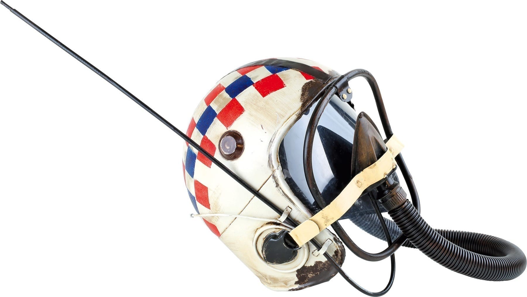 Les chasseurs dans les airs ! A l´aide de ce heaume style vintage, on conquiert le ciel ! Cette reproduction en métal est un travail jusqu´au moindre détail fait main. Avec tuyau de respiration, câbles, protection de vent en plastique ainsi que des losanges bleu et rouge peints à la main. Ce heaume attire tous les regards!