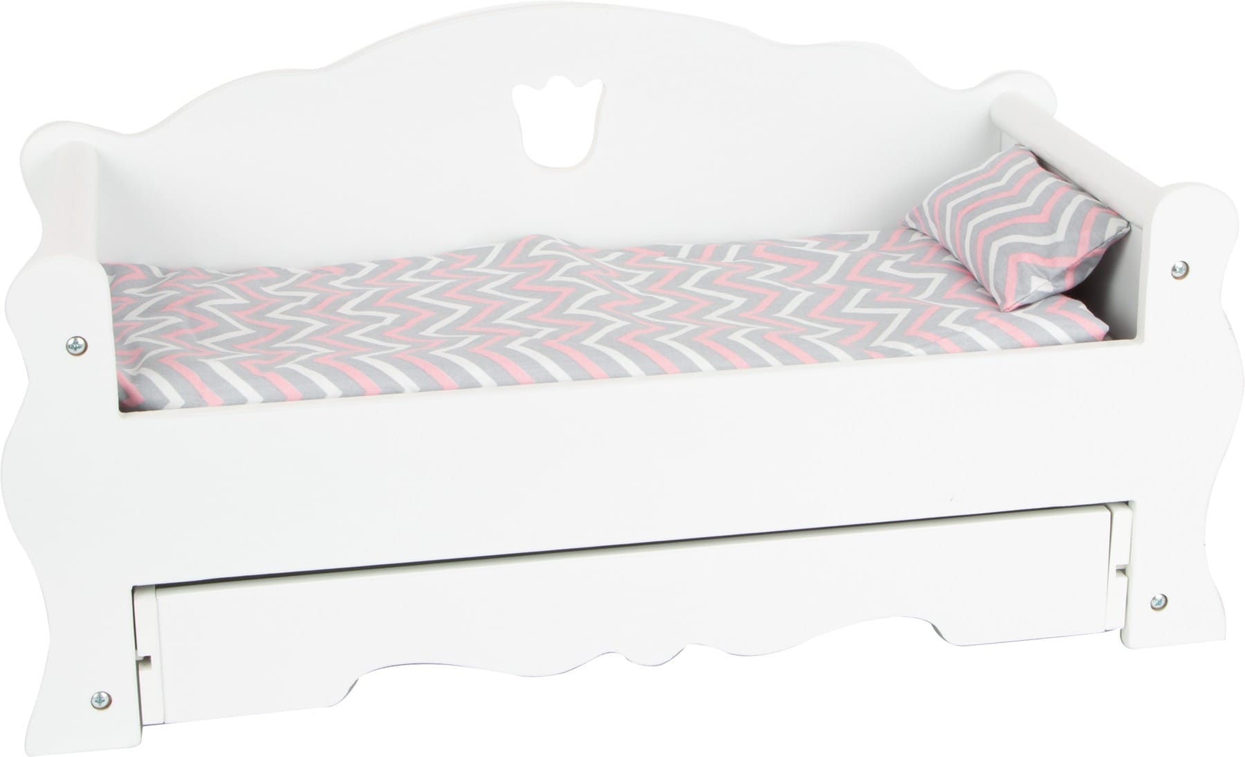 Maintenant, ça devient confortable ! Au deuxième coup d’œil, le lit de cette poupée s’avère être un canapé confortable. Le tiroir pratique permet non seulement de ranger la jolie parure de lit, mais peut également être utilisé comme deuxième endroit pour dormir. Sur le joli dessus de lit, les poupées se sentent à l’aise et peuvent se remettre d’une journée fatigante dans la chambre d’enfant. Grâce aux parties latérales pratiques, le lit peut être facilement ajusté dans l’espace par les mains des enfants ! Qui veut s’asseoir ensuite ?