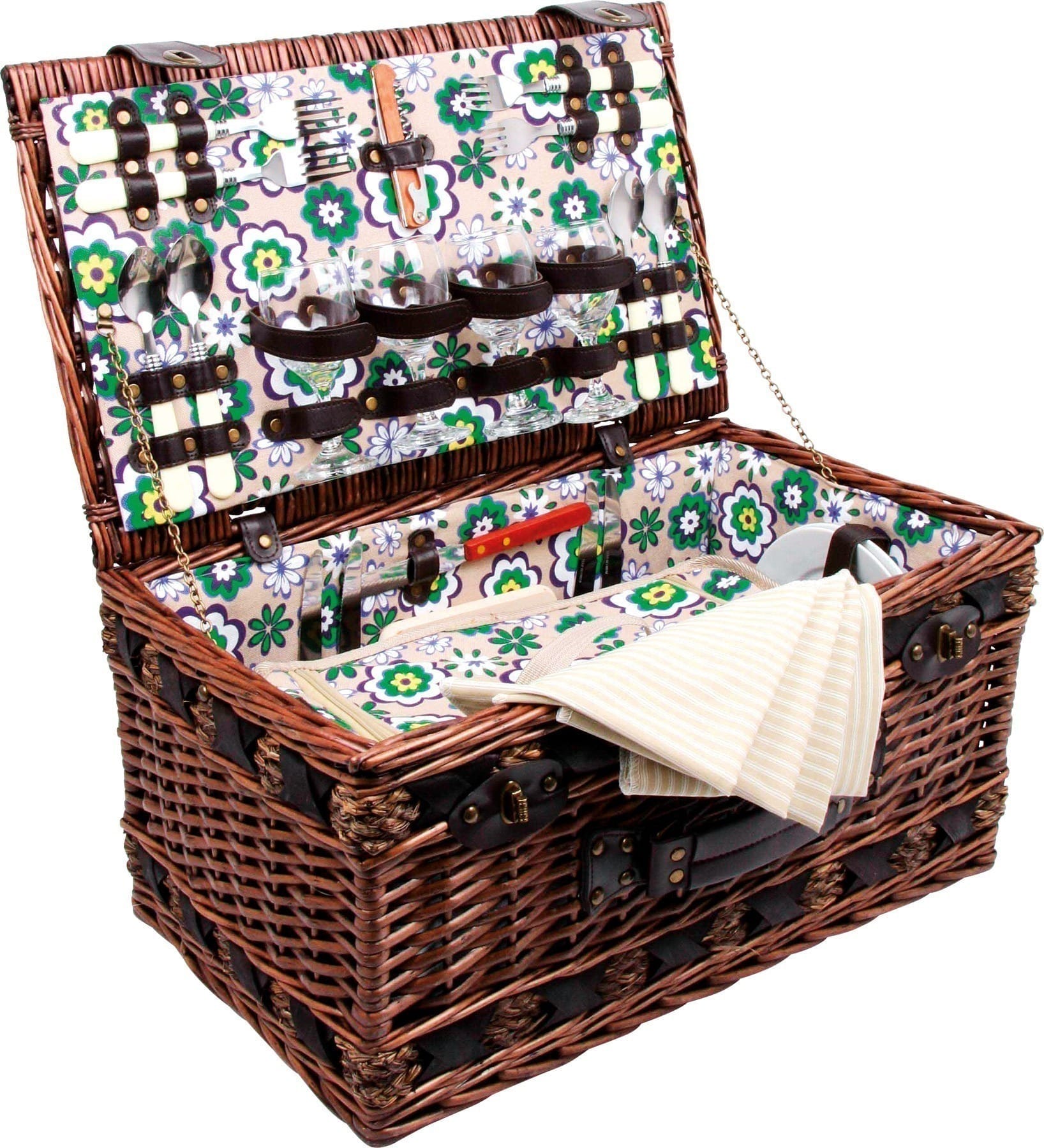 L‘équipement idéal pour le plaisir d‘un repas festif en plein air ! Avec sa vaisselle, ses couverts et verres à vin pour quatre personnes, ainsi que sa planche en bois, son tire-bouchon, ses serviettes, salière et poivrier, il permet de dresser une table pleine de style sur l‘herbe. Dans le splendide panier en osier à courroies solides les pièces sont maintenues fermement à l‘aide de bandes velcro et une glacière amovible conserve les mets et les boissons au frais.