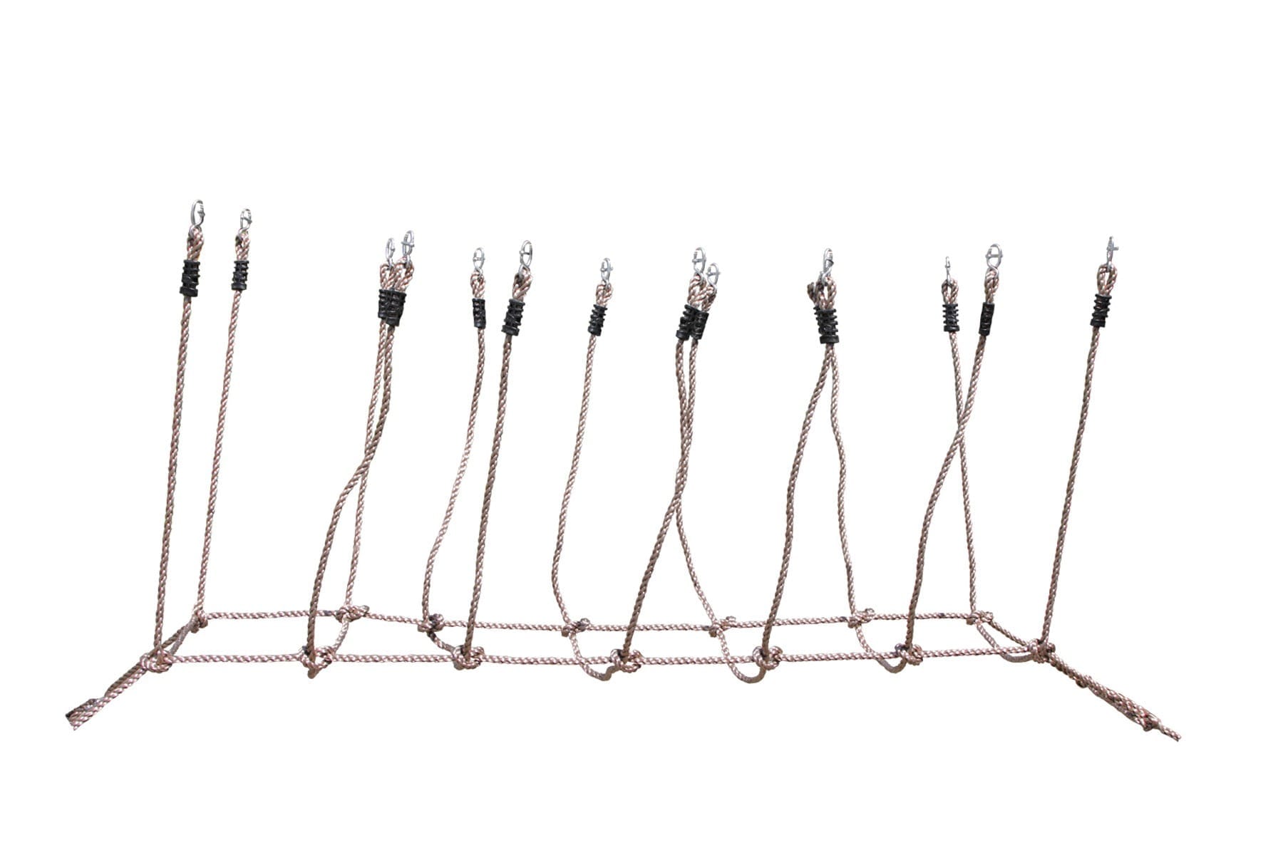 Grimper sur le pont en cordes plastique résistantes entraîne par le jeu le sens de l´équilibre et la maîtrise du corps! Un « must » à ajouter au portique de jeux dans le jardin ou à fixer rapidement entre 2 arbres! 14 oeillets de métal servent à fixer le pont et les pieds pourront avancer facilement sur les noeuds de cordages du bas.