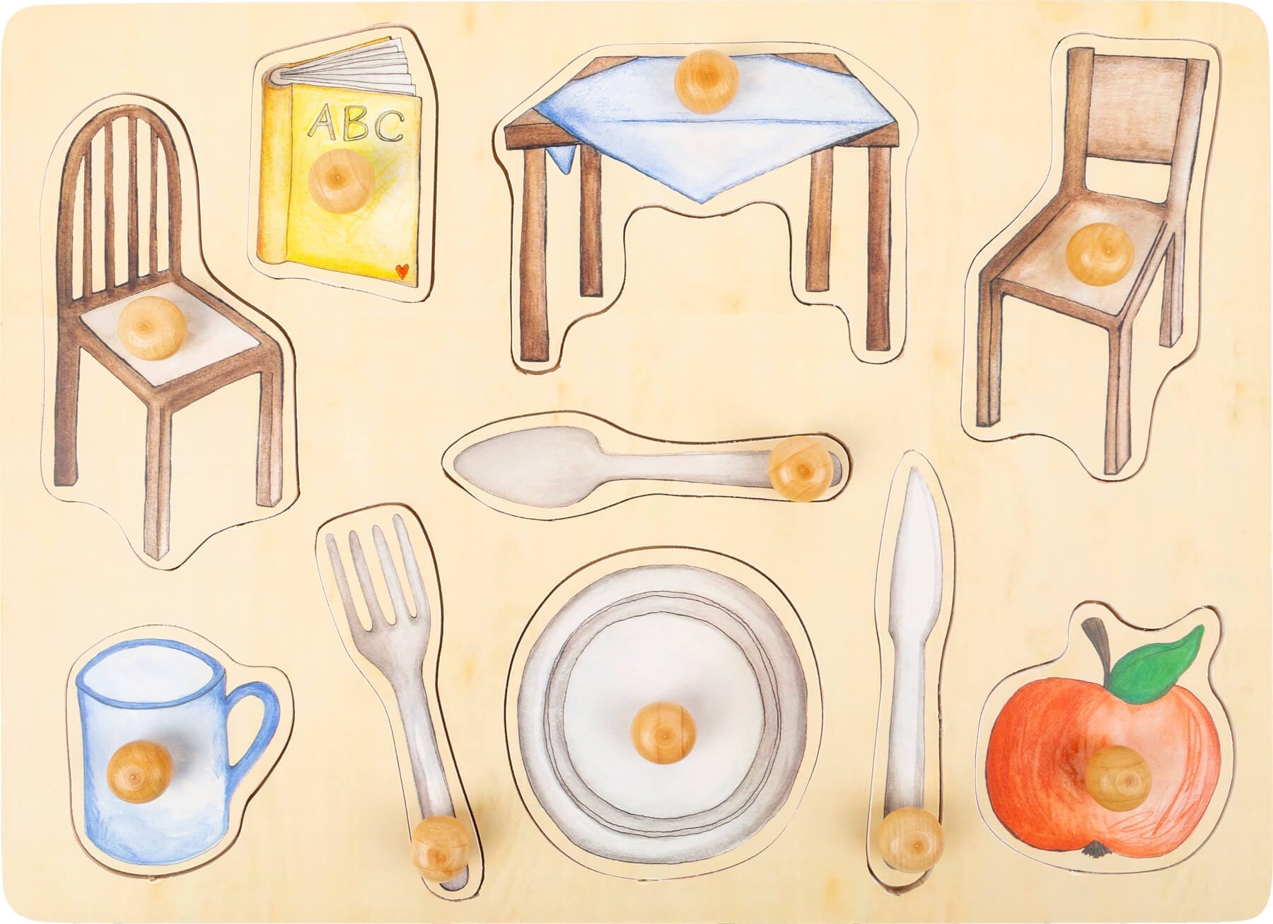 Qui connaît ces compagnons de tous les jours? Ce puzzle robuste en bois contient des pièces de puzzle illustrées avec amour avec des boutons en bois sur le thème d´objets du quotidien. Les pièces du puzzle peuvent être facilement saisies par les petits enfants et placées dans la forme pré-perforée. Cela encourage de façon ludique la motricité fine et la patience. Qui a vécu quoi aujourd’hui ?