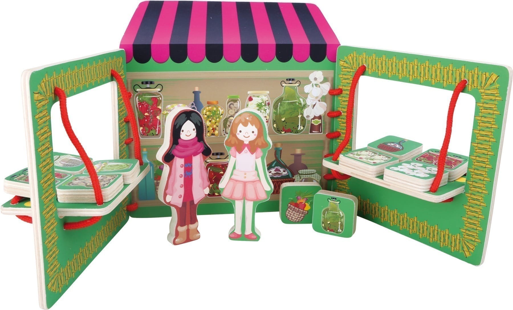 Quelle animation autour du stand de légumes. Les deux marchandes y vendent leurs délicieux légumes et leurs bocaux. Le superbe stand se monte sur les volets et les petits étals se fixent avec les cordons rouges fournis. Ainsi les légumes sont joliment présentés et lorsque tout est vendu, on ferme tout simplement les volets !